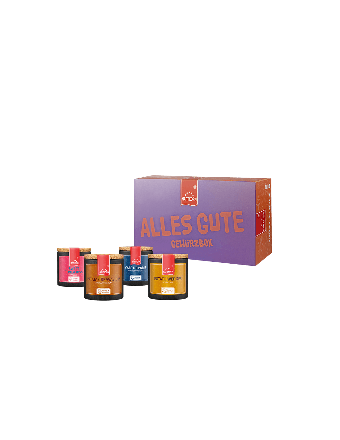 Herzlich-würzige Glückwünsche, Grüße und Gratulationen überreichst du absofort ganz bequem und vor allem richtig lecker mit der Hartkorn Alles Gute Gewürzbox für Sie. Mit dem Kuss der Tonkabohne - also unserem Sweet Tonka Kiss, versüßt du jeder Frau den Tag. Mit unserem Café de Paris Gewürz gelingt die perfekte Kräuterbutter im Nu und bildet zusammen mit dem Patatas Bravas Dip Gewürz das perfekto Duo für jeden Grillabend. Zack noch schnell den Potato Wedges den letzten Schliff verpasst und schon bist du von süß bis herzhaft perfekt ausgestattet.