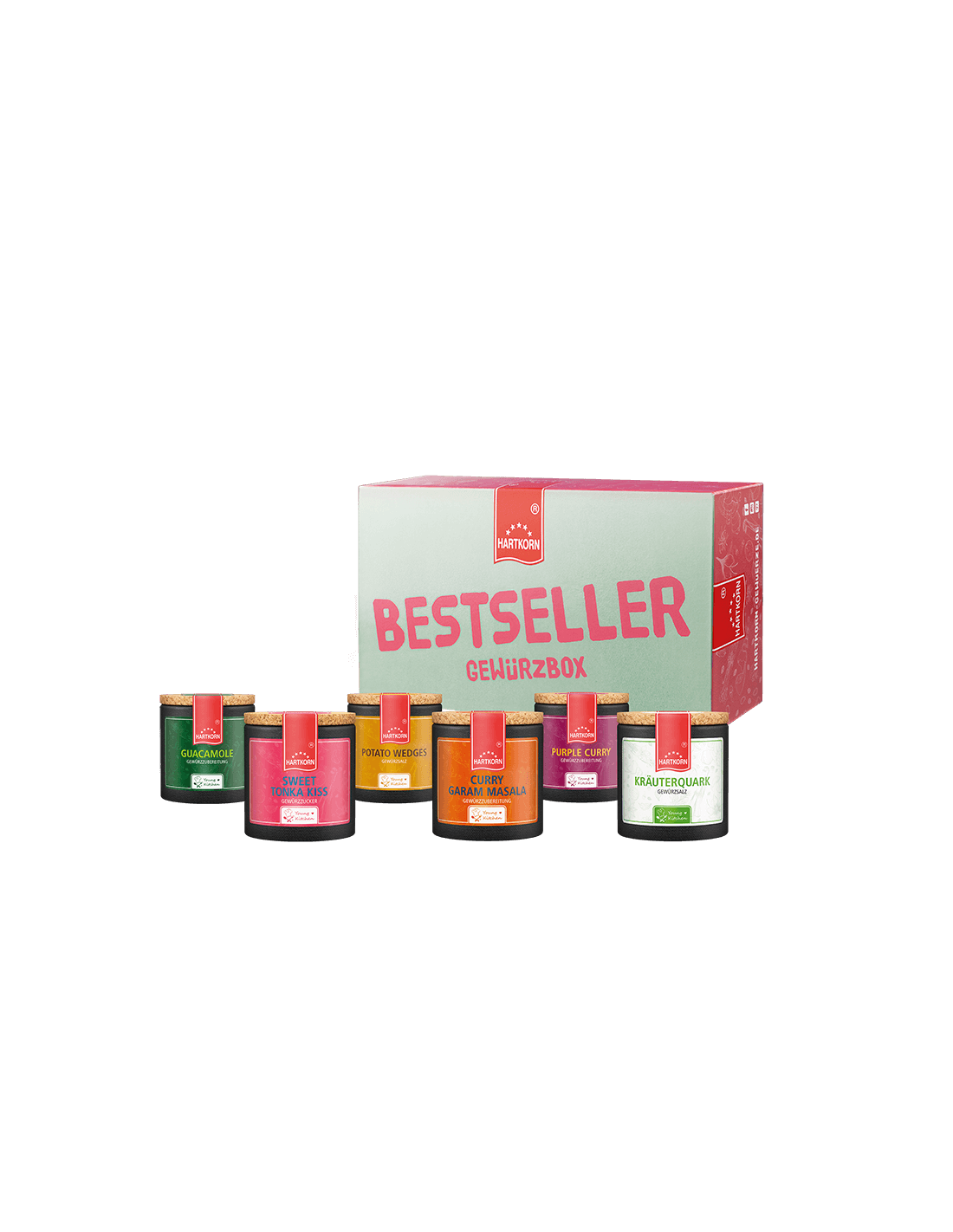 Du hast Lust auf jede Menge Abwechslung in deinen Töpfen und bist auf der Suche nach den Top-Stars unserer Gewürzwelt für deine Küche? Dann ist die Hartkorn Bestseller Gewürzbox genau die richtige für dich! In unserem schicken Karton vereinen sich nämlich die sechs beliebtesten Mischungen aus unserer Young Kitchen Serie: Mit einer wahren Explosion an Aromen beamt dich das Curry Garam Masala in die Küchen Indiens, während dich das Purple Curry auf direktem Wege in die kulinarische Welt des Orients entführt. Das Potato Wedges Gewürz hingegen ist ein echtes Must-Have für jeden Grillabend und sorgt im Handumdrehen für knusprig-krosse Kartoffelecken. Die perfekten Begleiter in Form von Dips bieten dir das Guacamole und Kräuterquark Gewürz. Aber natürlich darf auch das Passende für den süßen Zahn nicht fehlen. Egal ob Cappuccino, Crème brûlée oder Milchreis - unser Sweet Tonka Kiss setzt jeder Nascherei ein würziges Krönchen auf.