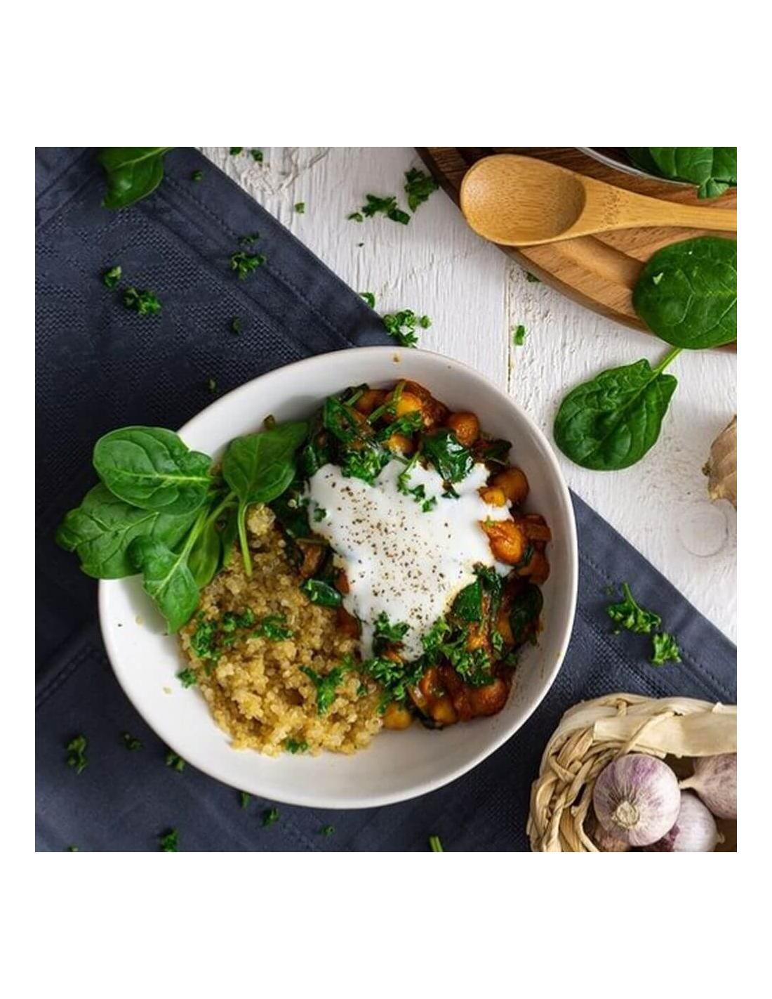 Spüle die Kichererbsen in einem Sieb ab und lasse sie und gut abtropfen. Den Knoblauch und die Zwiebeln schälen und hacken. Wasche die Tomaten und schneide sie anschließend in Würfel. Den Reis in 500 ml kochendem Salzwasser nach Packungsanweisung kochen. Erhitze etwas Öl in einem Topf und brate die Kichererbsen, den Knoblauch sowie die Zwiebeln darin an. Gib 2 Esslöffel Tomatenmark hinzu und lasse das Ganze kurz anschwitzen. Mit 250 ml Wasser ablöschen und aufkochen lassen bveor du die Tomatenwürfel einrührst. Nun etwa 10 Minuten auf mittlerer Hitze köcheln lassen und bei Bedarf etwas Wasser zufügen. Mit Salz, Pfeffer und 2 Teelöffel gestoßenem Bio Kreuzkümmel abschmecken. Den Babyspinat waschen und gut abtropfen lassen. Gib ihn zu den Kichererbsen und lasse ihn unter Rühren zusammenfallen. Mit Reis auf einem Teller anrichten. Wer möchte, kann noch einen Klecks Naturjoghurt auf den Teller geben.