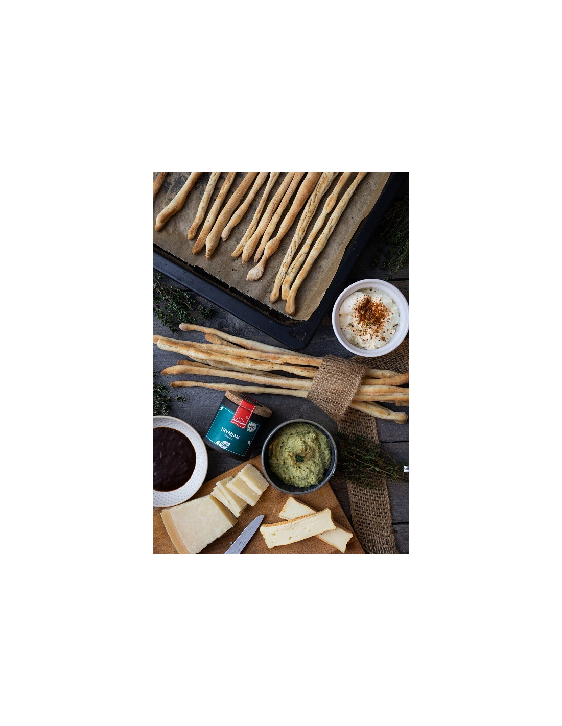 Im Anschluss die Arbeitsfläche leicht bemehlen, den Teig durchkneten, den Teig in kleine Stücke schneiden und zu der gewünschte Stangenlänge formen. Hierbei nehme ich einfach die Länge des Backblechs als Maßstab. Wie bereits oben erwähnt - je dünner die Stangen gerollt werden, desto knuspriger werden sie.