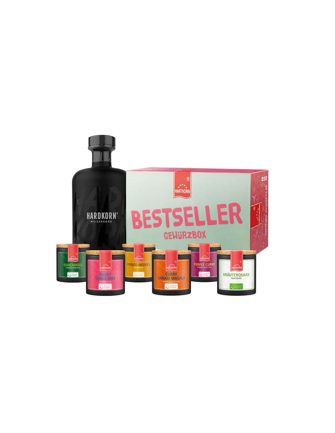 Bei Korn denkst du an verstaubte Kneipentresen und ein klassisches Herrengedeck? Na, dann mach dich bereit für ein neues Korn-Erlebnis aus dem Jetzt und Hier. Mit dem Hardkorn by Sophia Thomalla erlebt der Kneipenklassiker nämlich eine echte Wiedergeburt und schüttelt sein altbackenes Image ab. Dank einer extra Portion Malz und einer speziellen Filterung lässt sich der mild-süße Korn auch pur genießen. In Kombination mit der Hartkorn Bestseller Gewürzbox bekommst du die Top-Stars der Young Kitchen-Linie gleich dazu. Mach dich bereit für ein wahres Spektakel an Aromen, wenn du das Curry Garam Masala kostest und lass dich vom Purple Curry direkt in die kulinarische Welt Indiens begleiten. Mit dem Potato Wedges Gewürz bist du für jeden Grillabend bestens gerüstet und bereitest im Handumdrehen knusprige Kartoffelecken zu. Und was könnte dazu besser passen als Guacamole und Kräuterquark? Eben! Aber auch für die Naschkatzen und -kater unter euch darf das passende Gewürz nicht fehlen. Deshalb können wir gar nicht anders, als dir auch noch unseren Sweet Tonka Kiss mit in die Box zu packen. Damit werden Cappuccino, Milchreis oder Crème brûlée zum echten Hit. Du siehst also mit dem Hartkorn Bestseller + Hardkorn Set bekommst du aus beiden Welten das Beste!