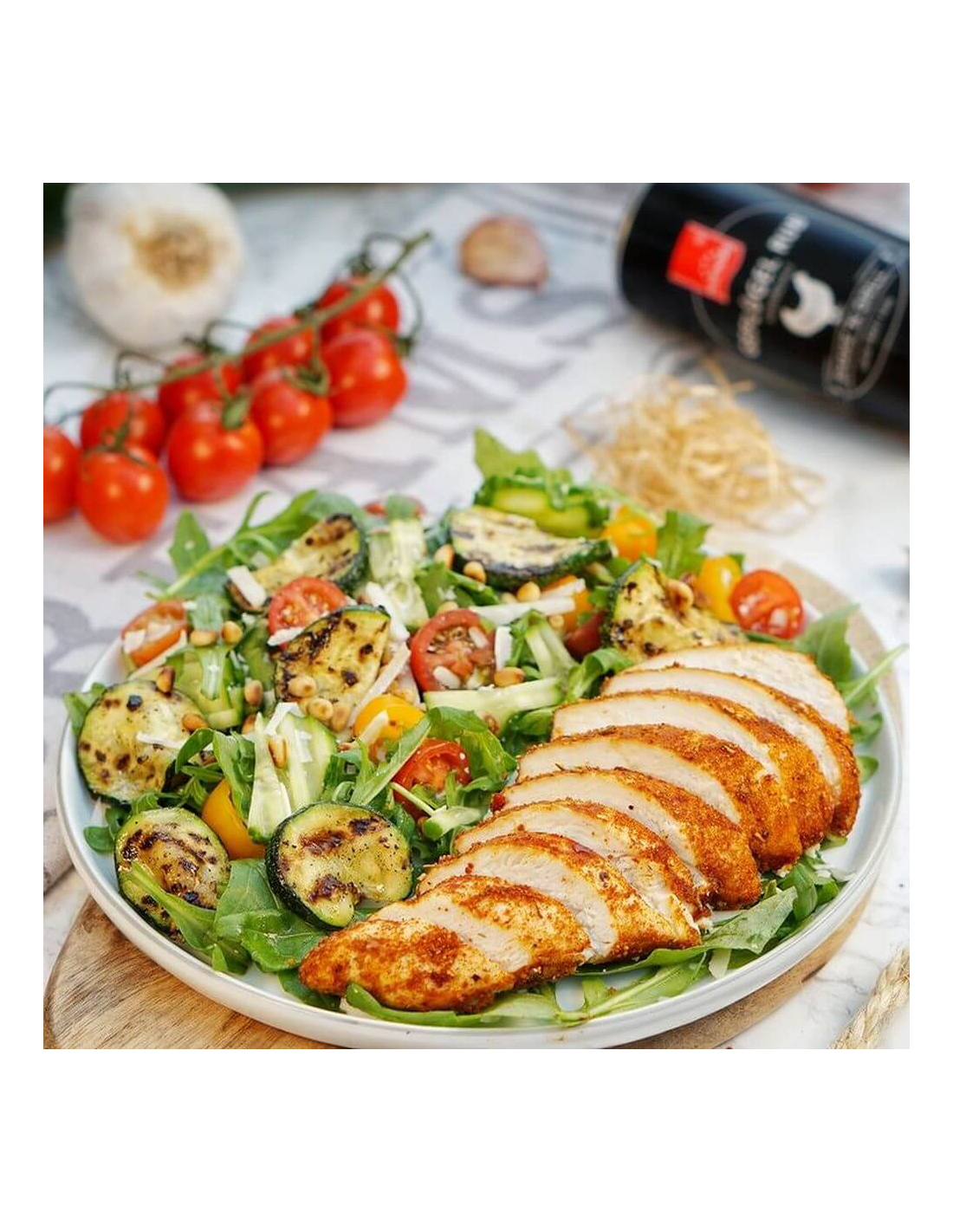 Die Hähnchenbrustfilets mit ca. einem Esslöffel Geflügel Rub würzen und entweder auf dem Grill oder im Ofen bei 200 °C Umluft für 15 min garen. Den Rucola, die Kirschtomaten und eine halbe Schlangengurke waschen, trocknen und klein schneiden. Anschließend die Zucchini in ca. 1 cm dicke Scheiben schneiden und in einer Schüssel mit 2 EL Olivenöl, 1/2 Teelöffel Pfeffer, 1/2 Teelöffel Salz sowie einer klein geschnittenen Knoblauchzehe vermischen. Die Zucchini Scheiben auf dem Grill oder der Grillpfanne von jeder Seite scharf angrillen. Lasse sie nun auf einem Teller abkühlen. Röste die Pinienkerne an und hobel den Parmesan. Alle Zutaten miteinander vermischen. Das Hähnchen nun in Stücke schneiden und gemeinsam servieren.