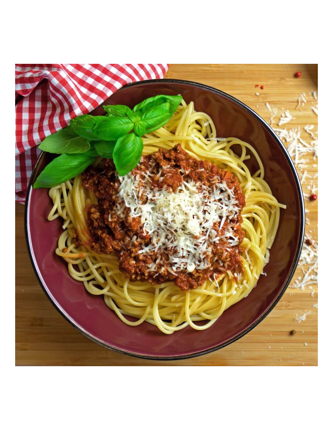 Lust auf Nudeln? Unser Tipp: eine leckere Bolognese dazu! 250 g Hackfleisch in etwas Öl anbraten. 2 EL Bolognese Gewürz und 1 EL Tomatenmark unterrühren. Mit 1 Dose stückigen Tomaten ablöschen. 10 – 15 Min. köcheln lassen und fertig.