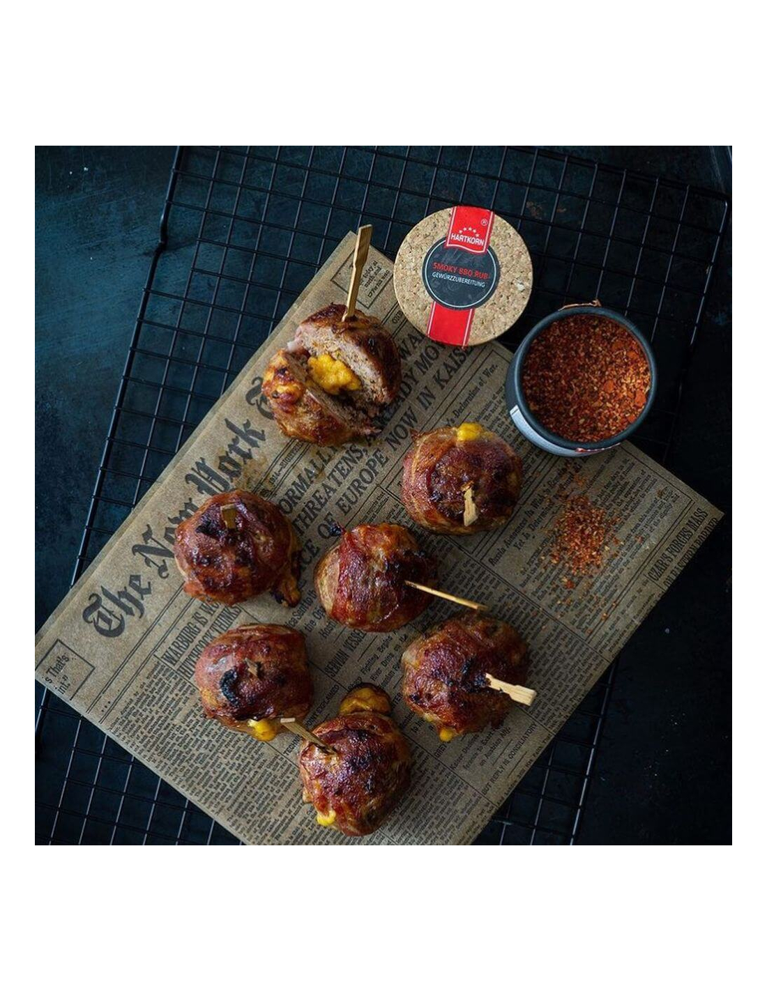 1. Das Rinderhackfleisch mit Smoky BBQ Rub würzen. In etwa 8 gleiche Portionen aufteilen. Ein Stück Cheddar in die Mitte drücken und ein Bällchen drumherum formen. Wichtig ist, dass das Fleisch den Käse komplett umschließt.