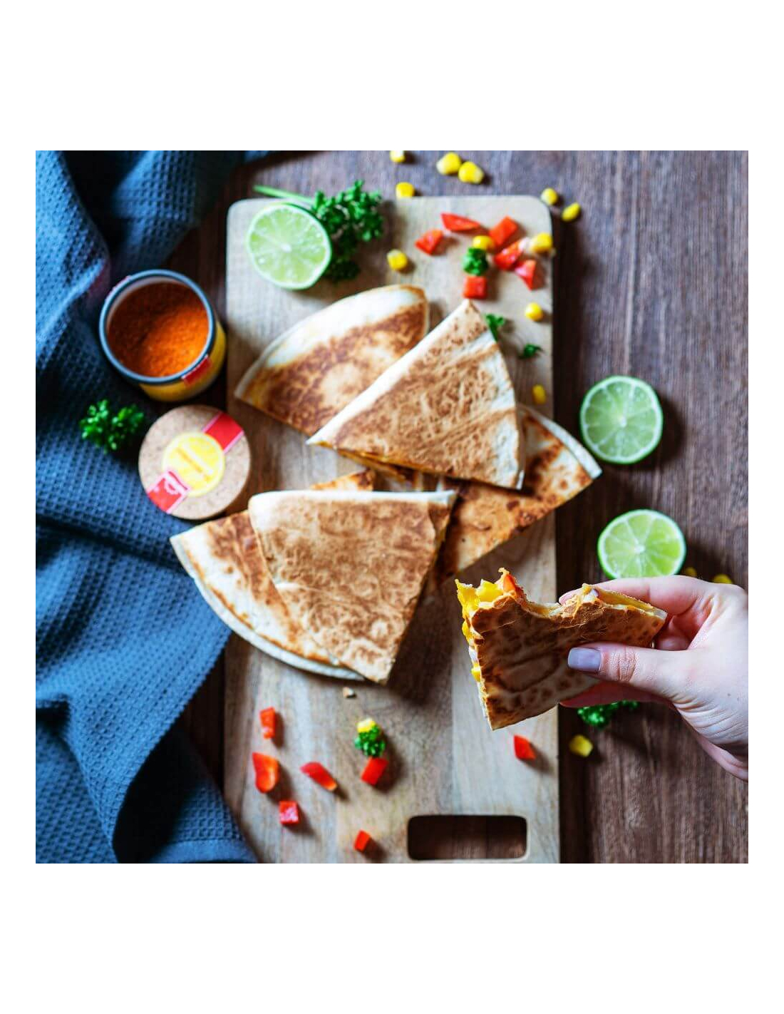2. Die Hälfte eines Tortillafladens mit Gemüse und Käse belegen. Eine Prise Young Kitchen Tex Mex über den Belag geben.