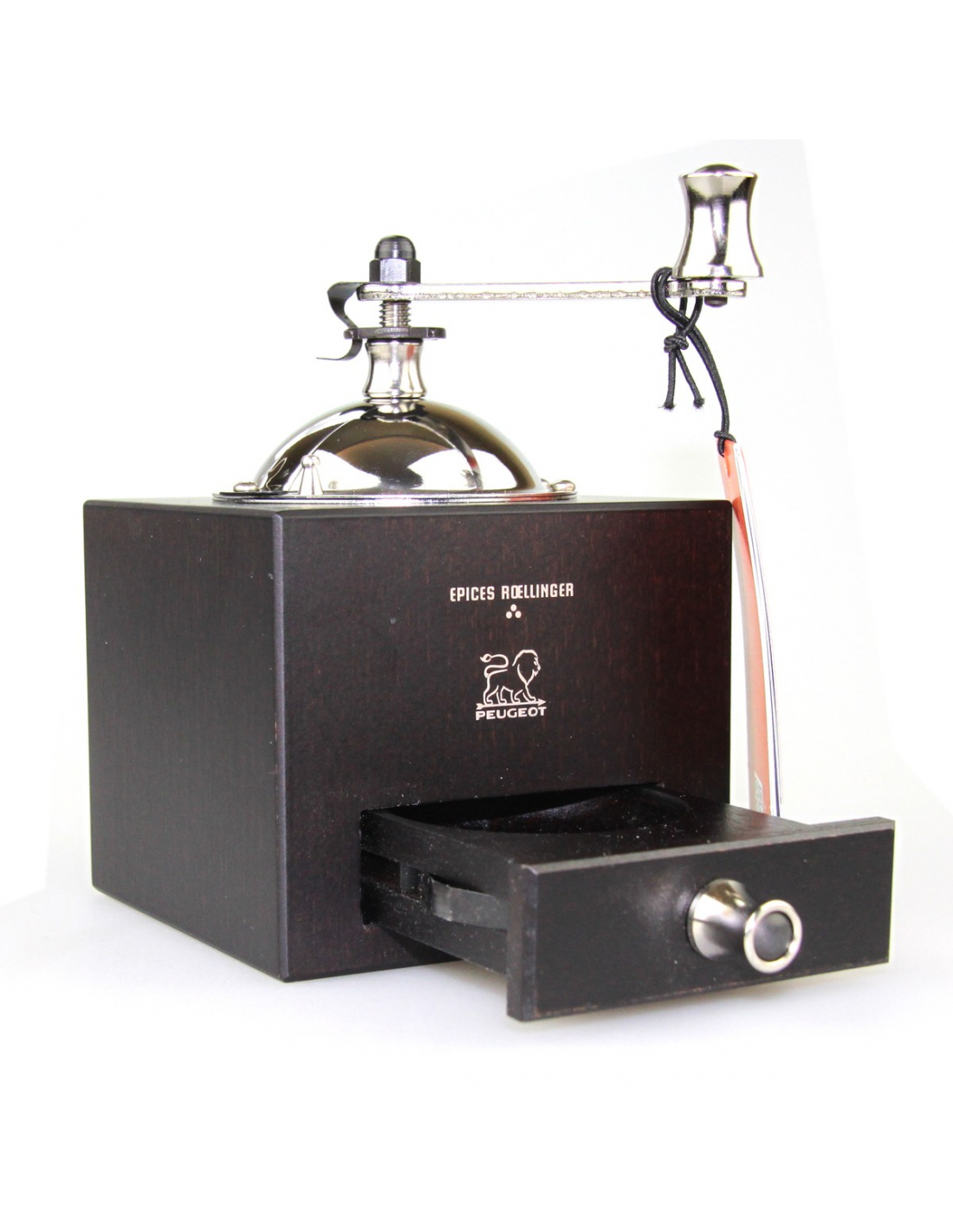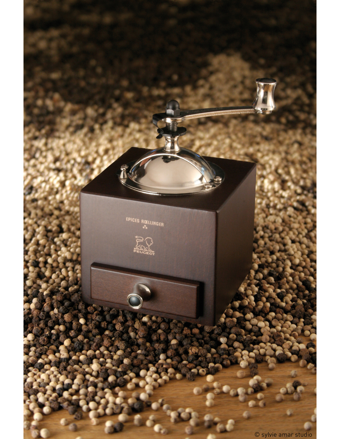 Die kleine Schublade kann man nach Belieben herausnehmen, so dass der Pfeffer oder die Gewürze direkt auf die Speisen rieseln. Le Moulin d'Olivier Roellinger ist Peugeot Handpfeffermühle Moulin Épices d´Oliver Roellingeraus schokoladenbraunem Buchenholz, das Mahlwerk aus hartem Werkzeugstahl.