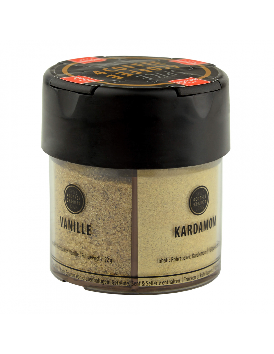 The 4 flavored sugars are practically packed in an acrylic shaker with 4 chambers. So that each aroma retains its unique taste, each chamber has its own spreader with lid.