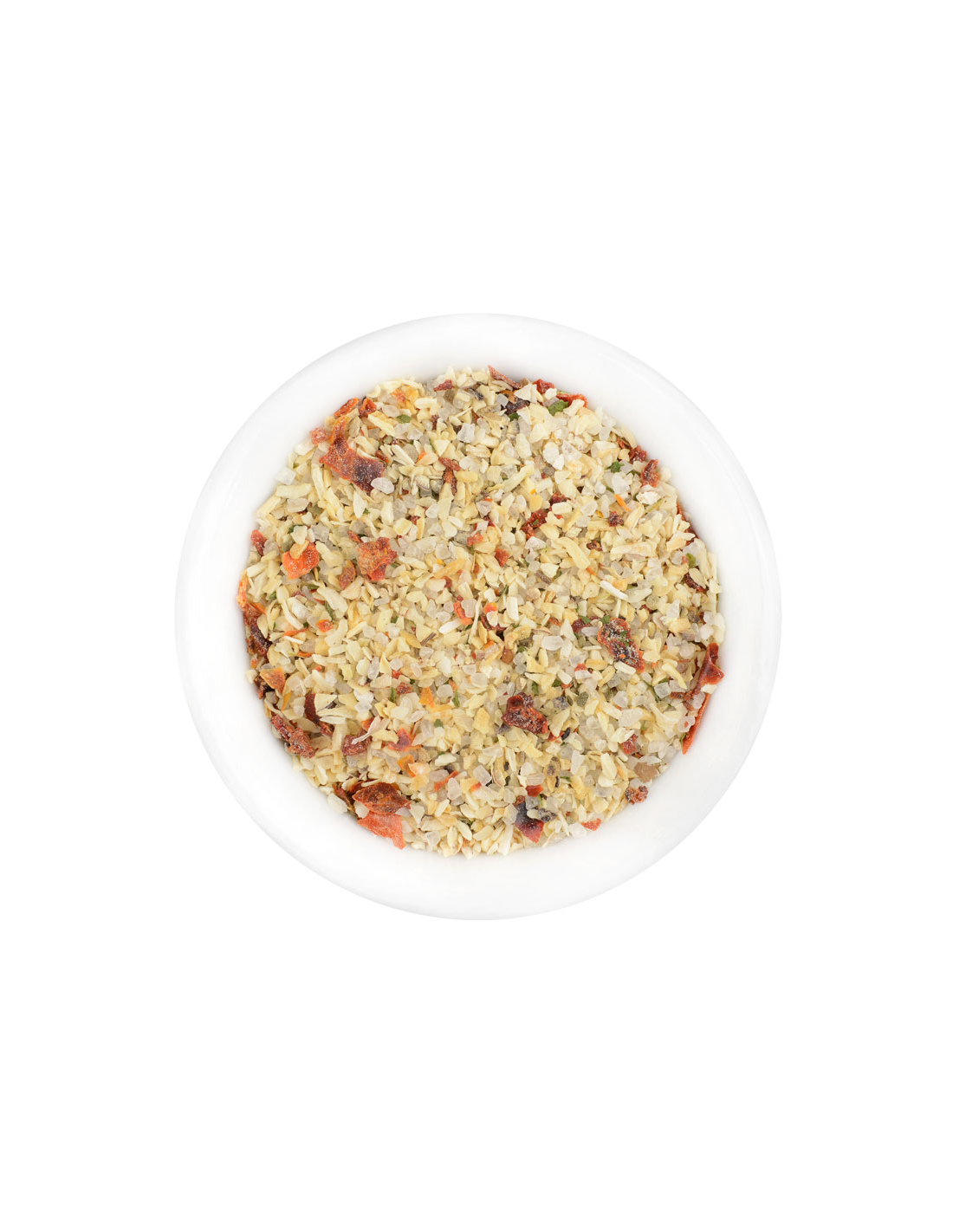 Simple, delicious, Italian! Caprese, the classic dish of buffalo mozzarella and tomato slices, topped with lush green basil and a drizzle of olive oil is quick to prepare. With our tomato mozzarella seasoning, you can add the Mediterranean icing on the cake thanks to the sweetness of onion, bell bell pepper, basil and parsley, but also the slight spiciness of pepper paired with sea salt.