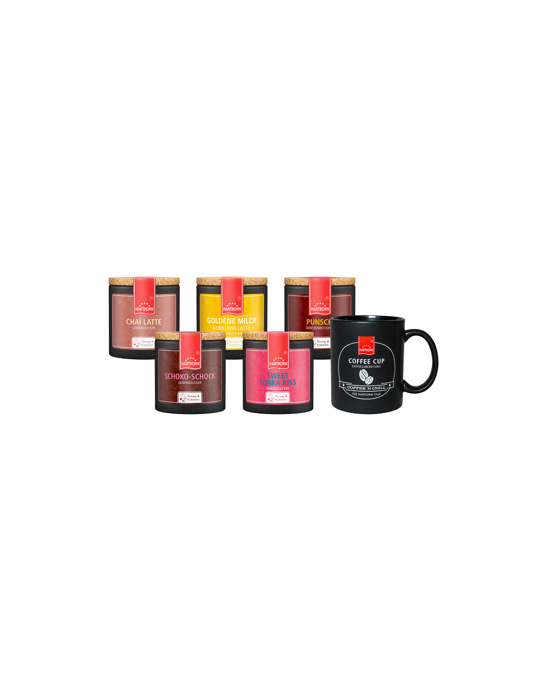 Whether summer or winter, cold and rainy days that call for a good dose of coziness are plentiful in this country. That's why we've put together the perfect spice set for warm drinks. The question of the icing on the cake for your beloved coffee you will never have to ask yourself again. In the set, you'll find several delicious toppings for that special moment of pleasure. The Young Kitchen Sweet Tonka Kiss spiced sugar and the Chai Latte spice make your favorite coffee even more indispensable. But you are also well prepared for cocoa with the Young Kitchen Schoko Schock spiced sugar. You'll find the right Young Kitchen spice for the cult drink Golden Milk as well as the right blend for a fruity-spicy punch. But here's the kicker: so that you don't have to enjoy your delicious hot beverages in just any old cup, we've included our stylish, matte-black Hartkorn Coffee Cup from Rastal.