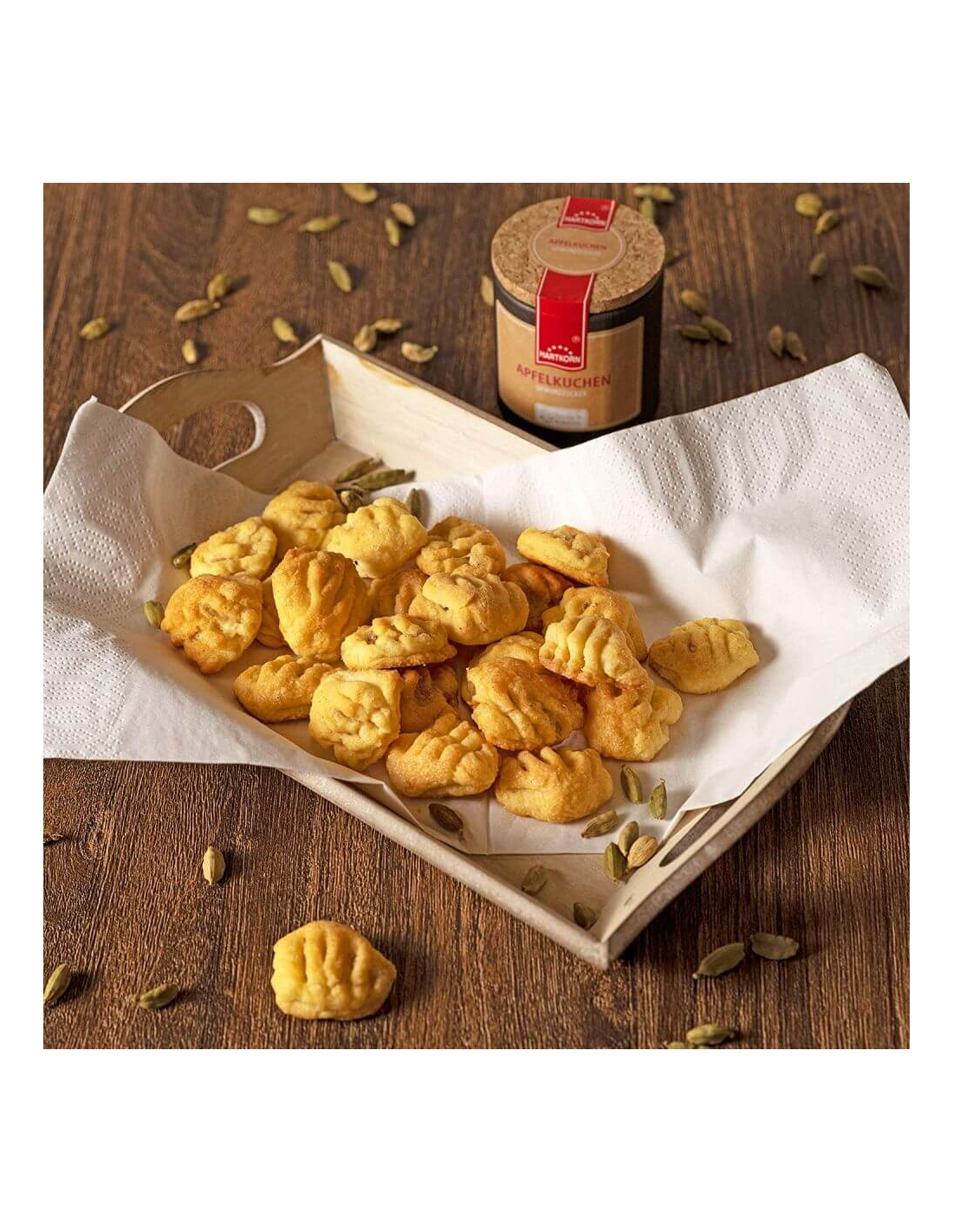 spice and place in a quiche dish. Mix 120 g soft butter with 120 g sugar and 1 tsp apple pie spice. Then knead with 200 g flour and spread in coarse crumbles over the apples. Bake at 190 degrees (convection oven) for approx. 25 - 30 min.