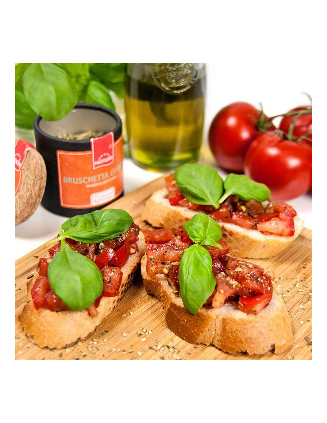 Our Young-Kitchen Bruschetta spice gives your baguette the Mediterranean flair as a light appetizer for a garden party or just for in between. Mix 1 tbsp spice with 2 tbsp olive oil. A medium-sized tomato cut into small pieces mixed with herbal oil u. arrange on toasted baguette.